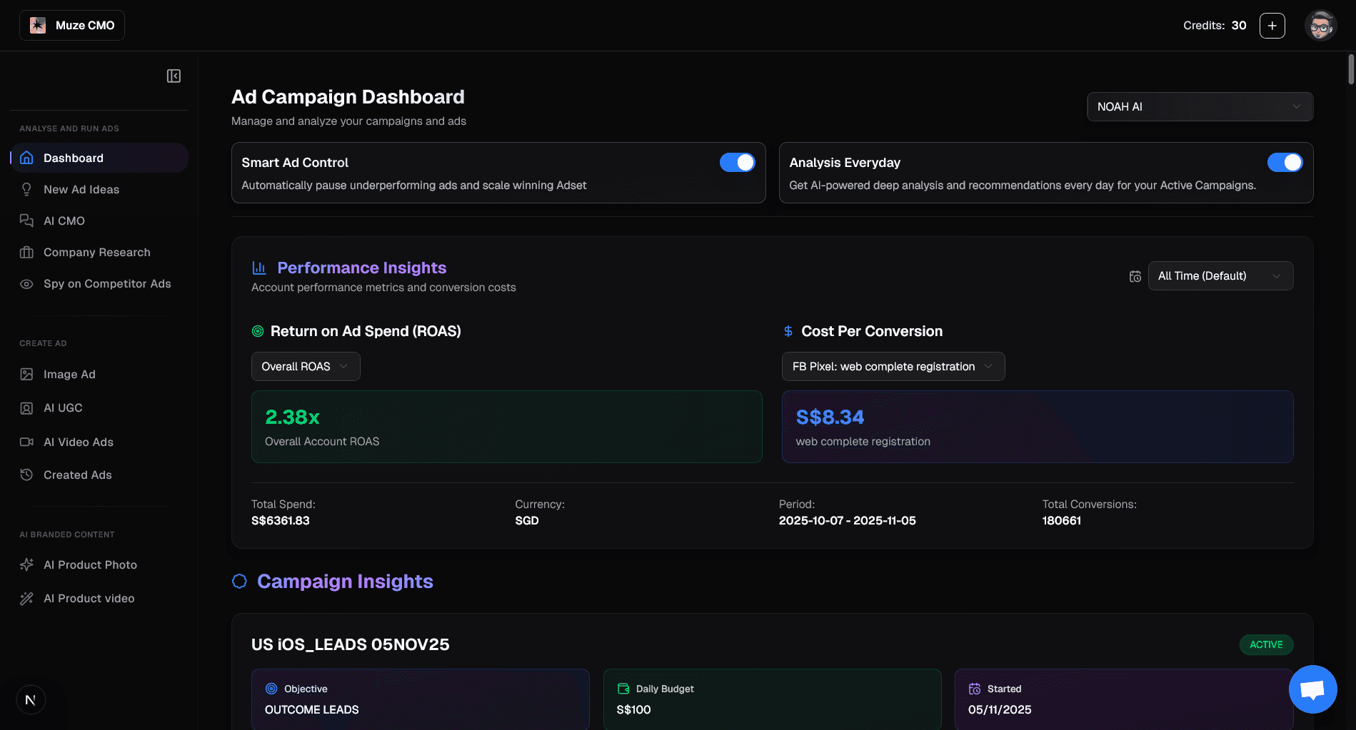 Toggle "Smart Ad Control" to let AI automatically pause underperforming ads and scale winners.