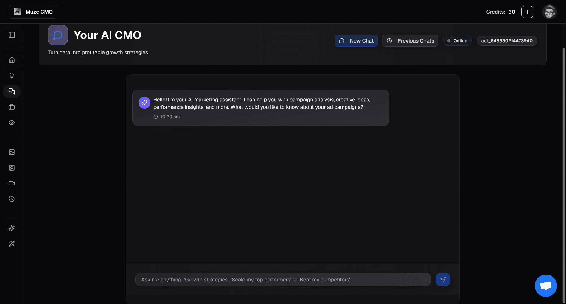 Start by asking your AI CMO anything about your marketing, campaigns, or creative strategy—get instant, personalized advice and insights!
